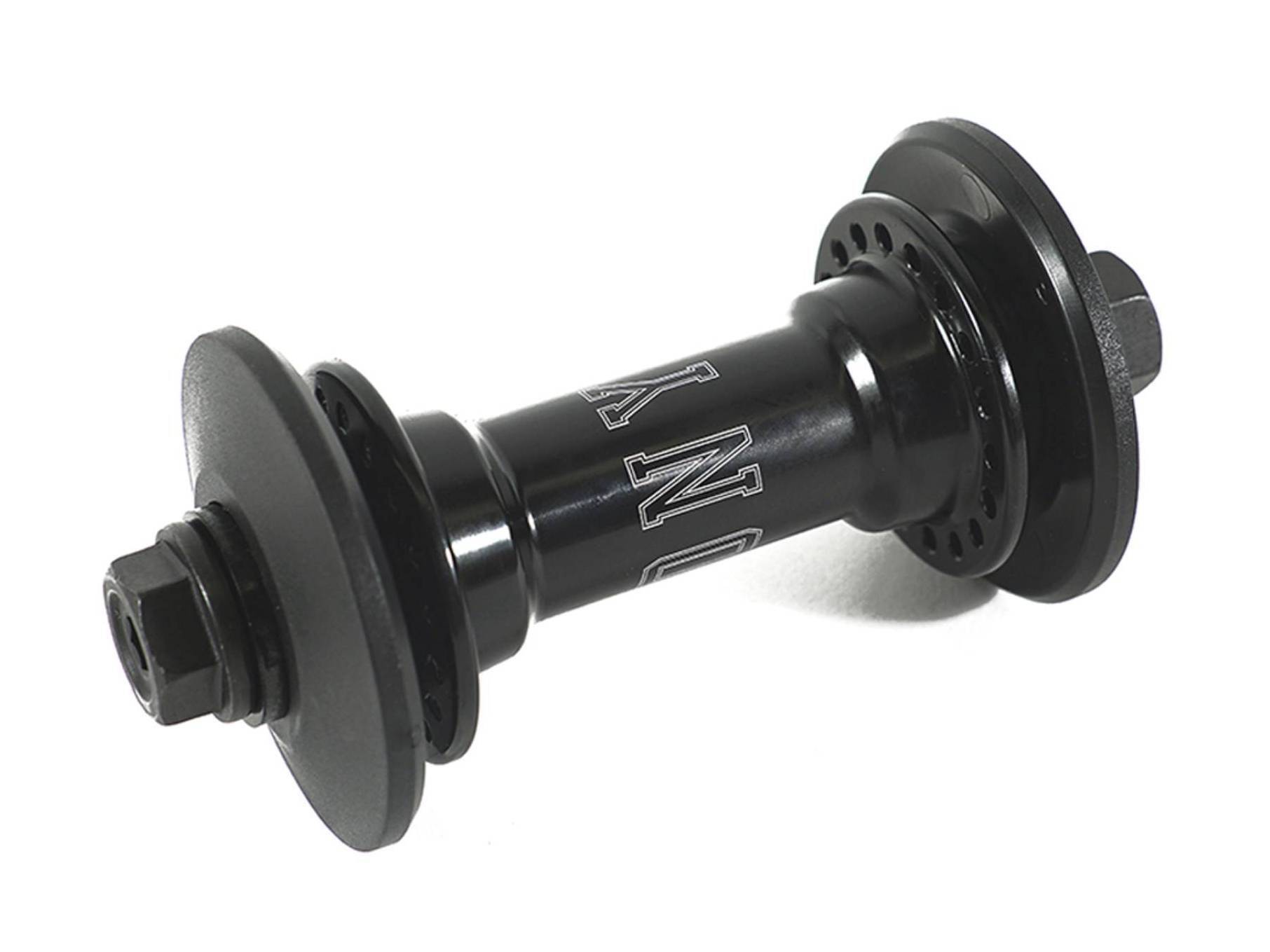 Легкая передняя втулка с низкими фланцами, с корпусом из 6061-Т6 алюминия и осью из 4130 Cr-mo, болты 10мм под 17мм ключ и 6мм шестигранник. Шаг резьбы болта 3/8” x 24 TPI, алюминиевые шайбы. Оснащена качественными подшипниками. 2 пластиковых хабгарда в комплекте.