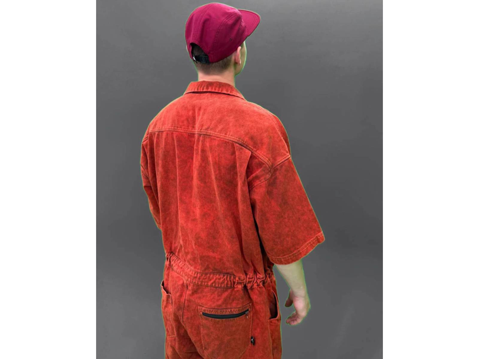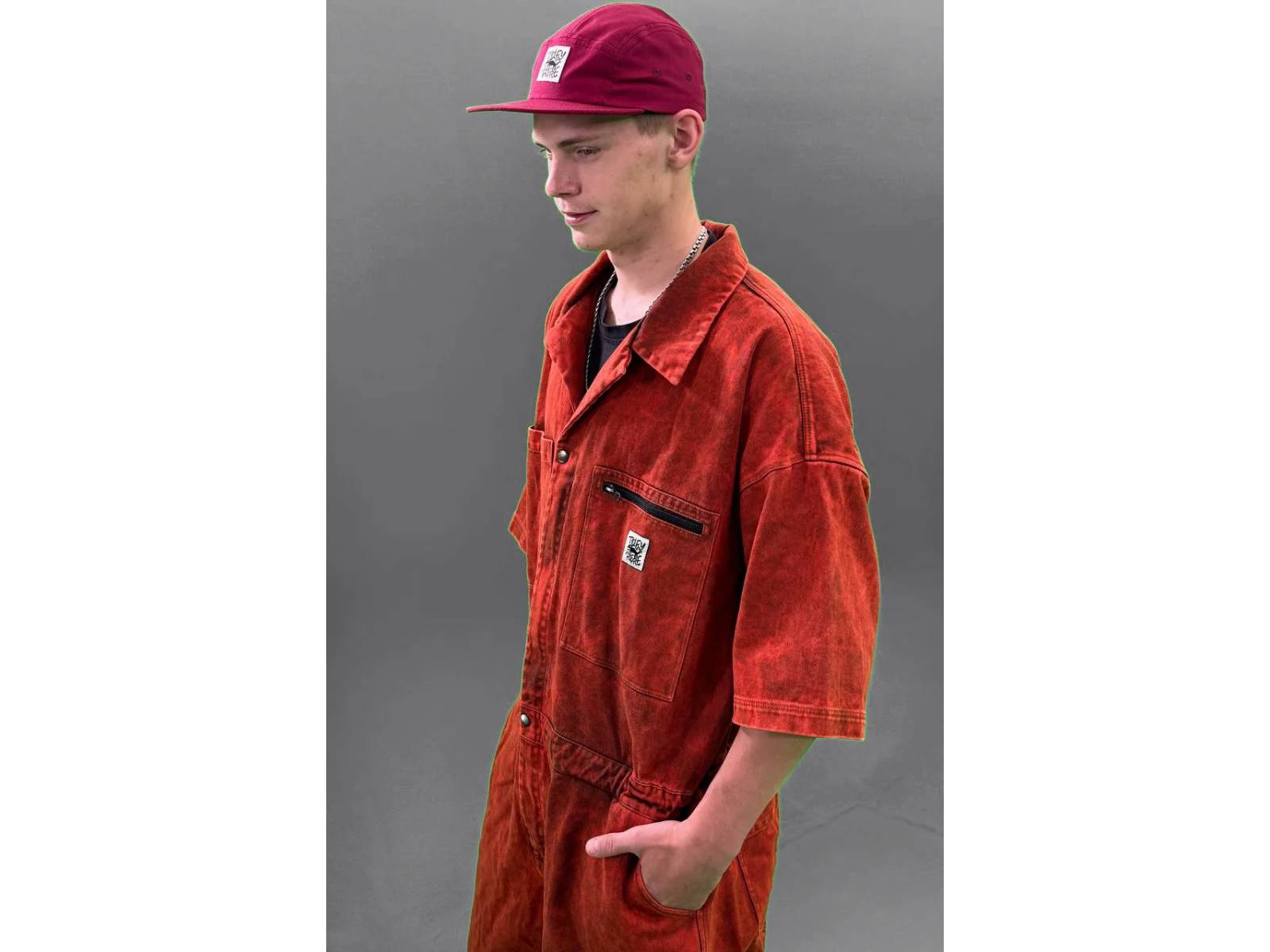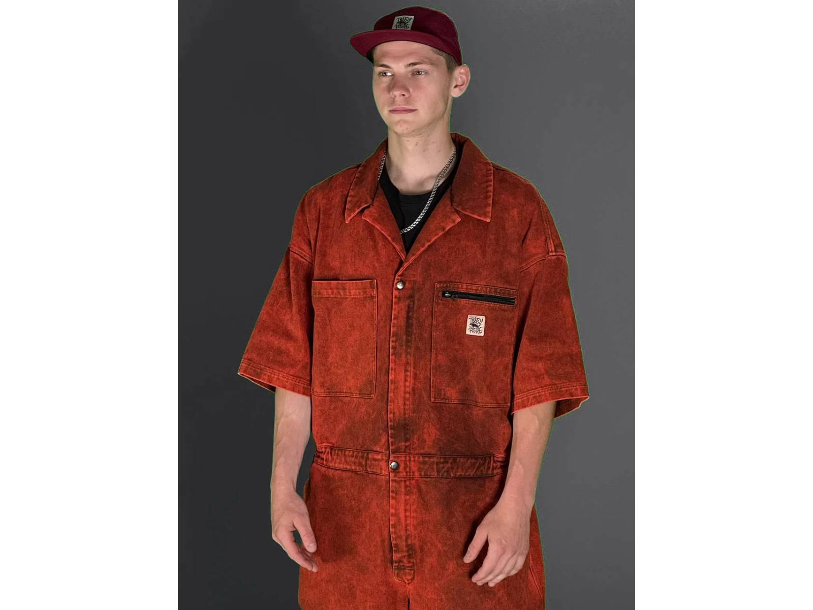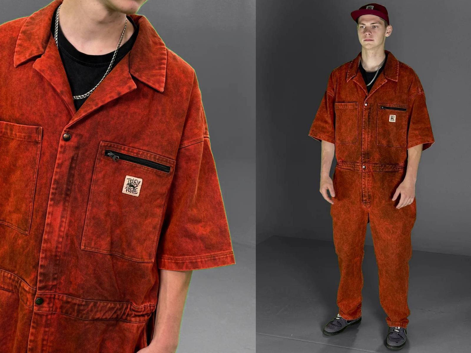 На ярлыке - ОНИ сделали изображение проекта с описанием идеологии бренда. Комбинезон имеет свободный крой из очень плотной джинсовой ткани и лекало оверсайз.