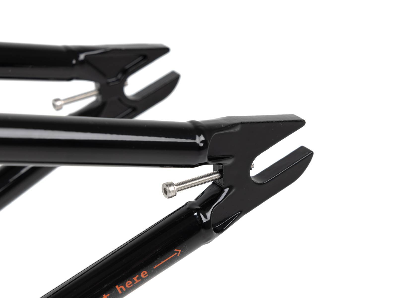 Верхняя труба имеет 32мм диаметр, в то время как нижняя труба имеет все 35мм и термическую закалку, благодаря этим параметрам получается классический внешний вид. Перья имеют диапазон 12.8-13.2''. Можно укоротить (сточить) дропауты с концов, если они будут вам мешать скользить в самом задвинутом положении колеса, это никак не влияет на гарантию (точить дропауты вглубь запрещено).