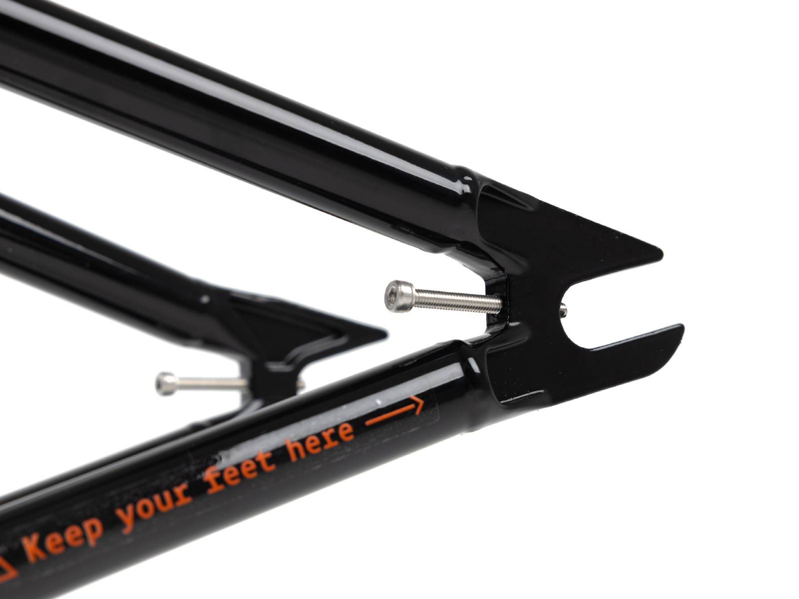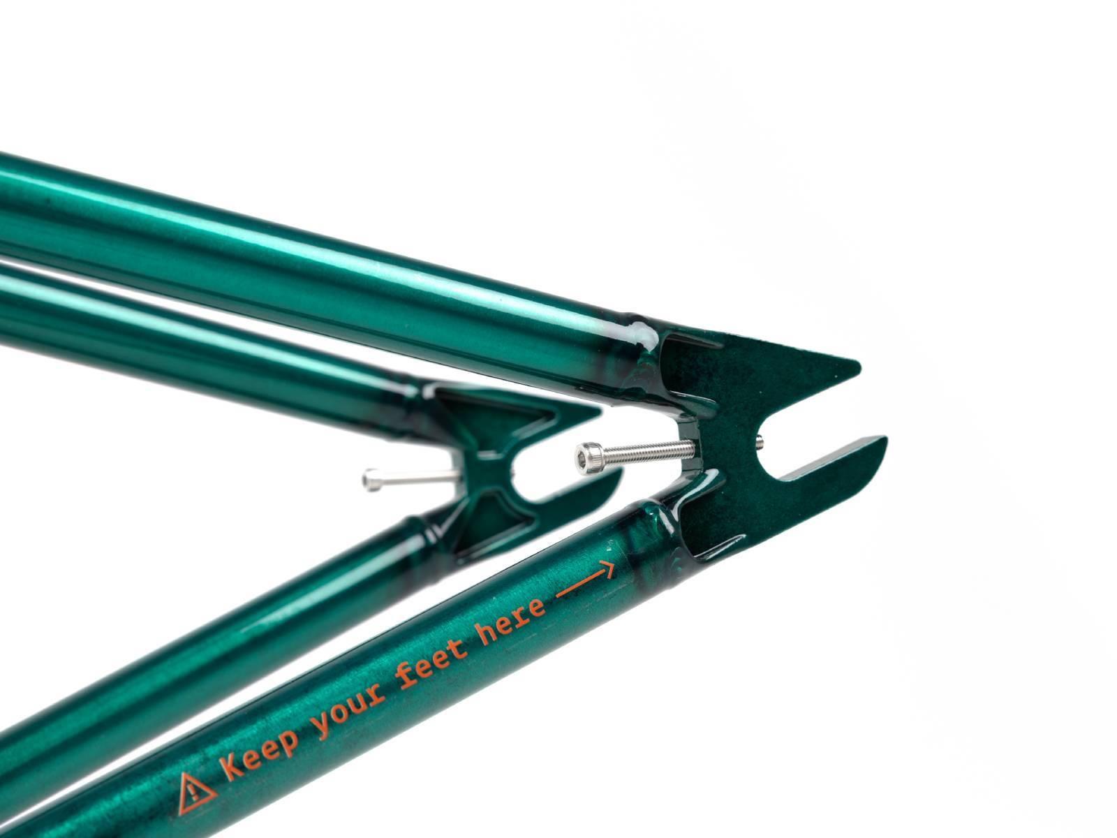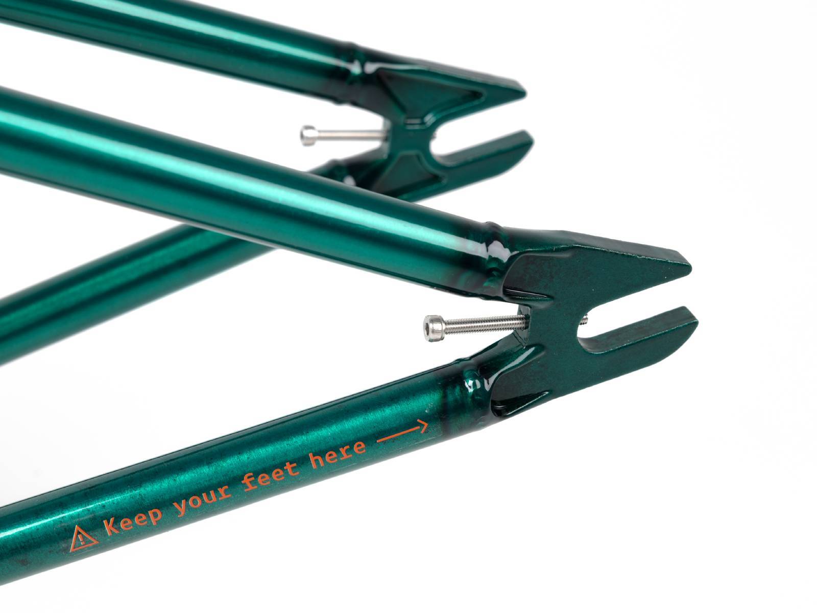 Подкова полая у каретки и монолитная вокруг колеса с термообработкой для увеличения прочности. Нижние перья закаленные для максимального сопротивления вмятинам при гриндах.
