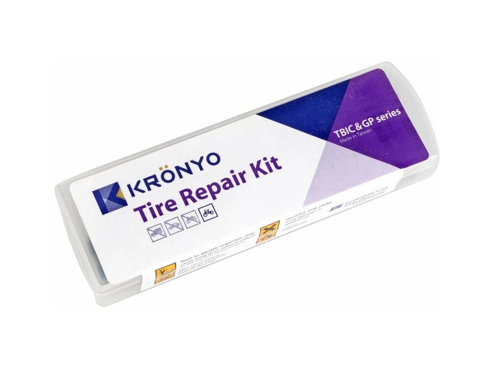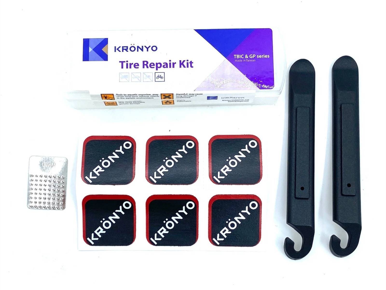 Ремкомплект KRONYO для велосипедных камер. В комплекте: 2 монтажки, металлическая шкурка (чтобы зачистить место прокола), 6шт самоклеящиеся заплатки и компактный пластиковый бокс. Страна производитель Тайвань.