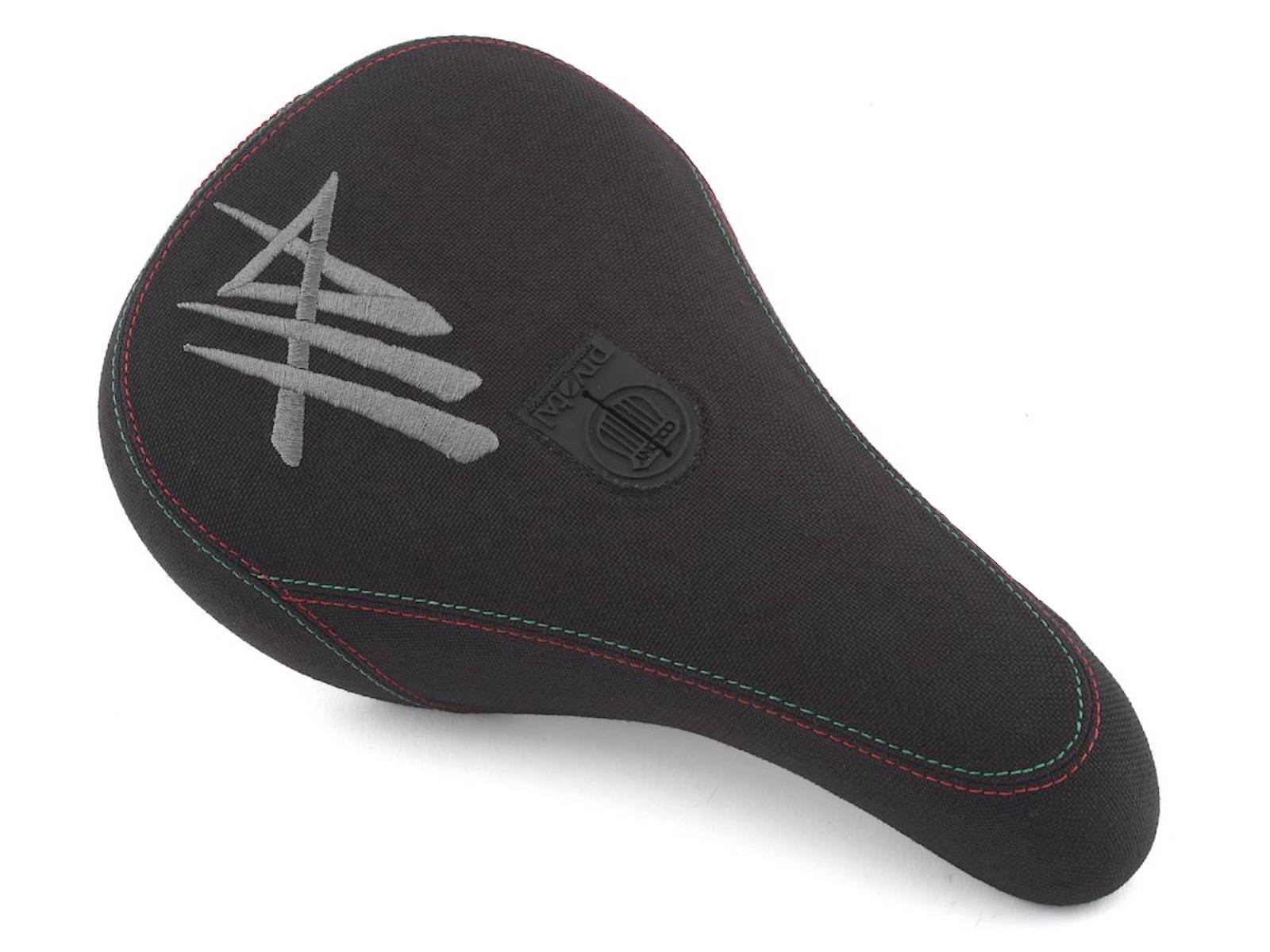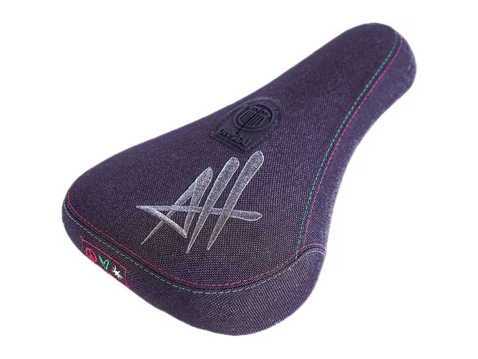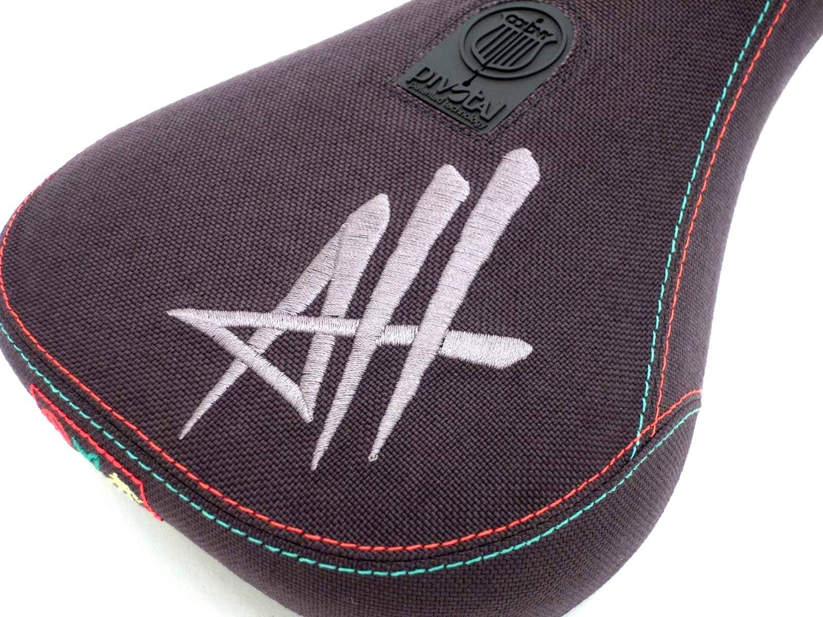 Толстое и мягкое седло с креплением Pivotal. Седло прикручивается сквозным болтом сверху к подседельному штырю и легко регулируется угол наклона. Материал обшивки - прочная кевларовая ткань. Классическая платформа. Корпус имеет множество рёбер жёсткости. Вышитые логотипы на верхней части седла с инициалами райдера, а так же на задней части выполненные вышивкой эмодзи. Стильная цветная строчка на швах. Промодель Alex Hiam.