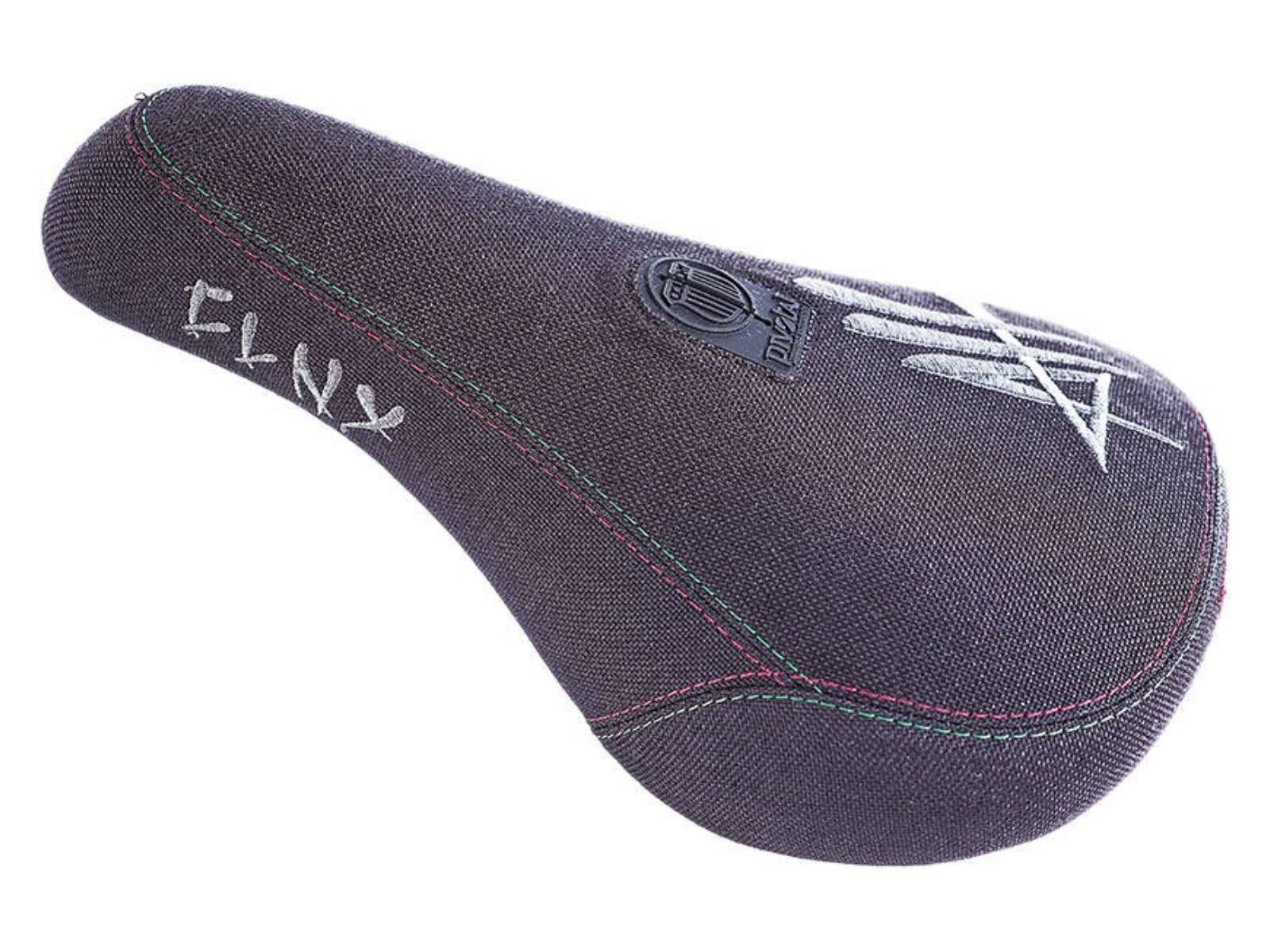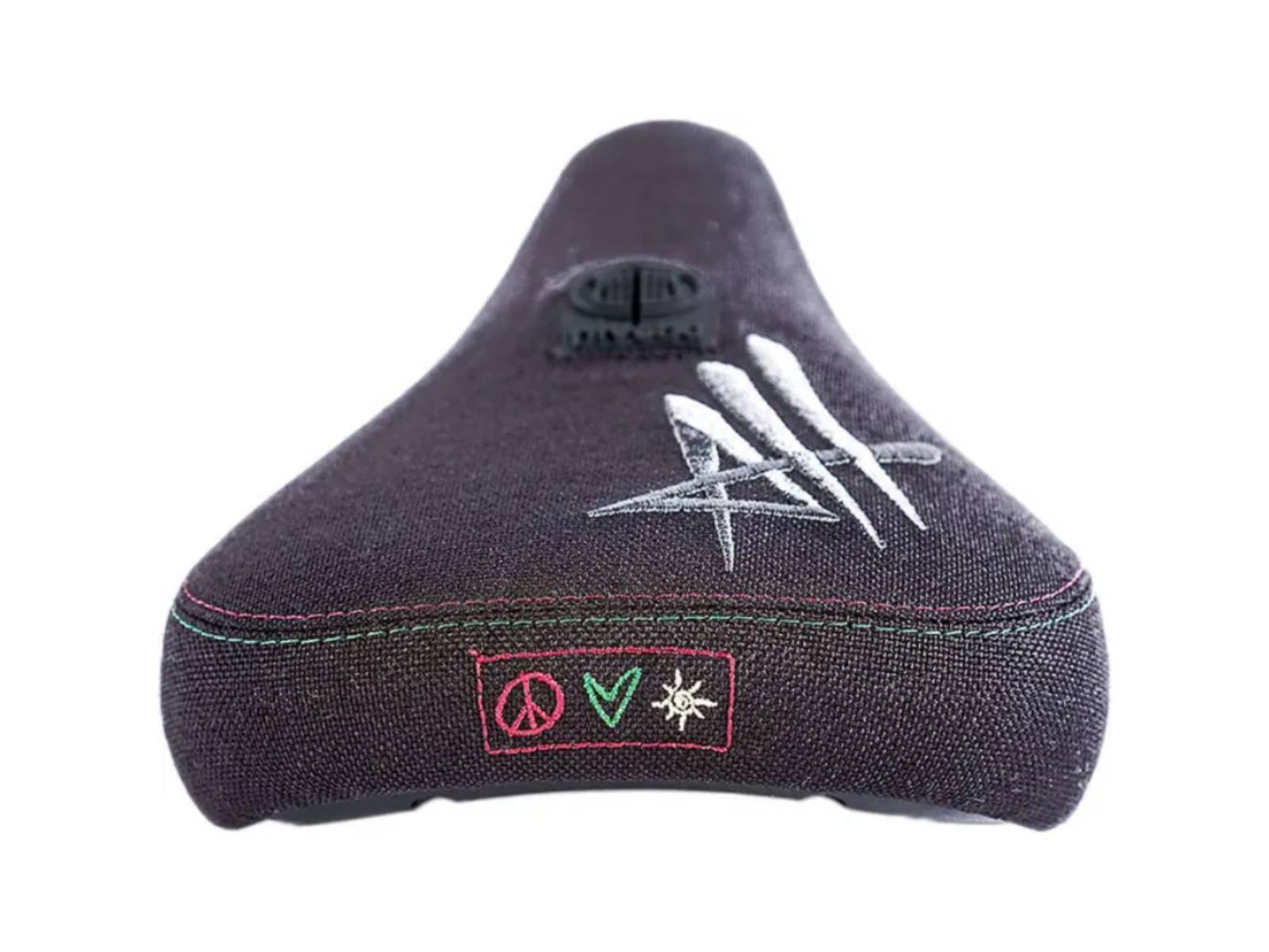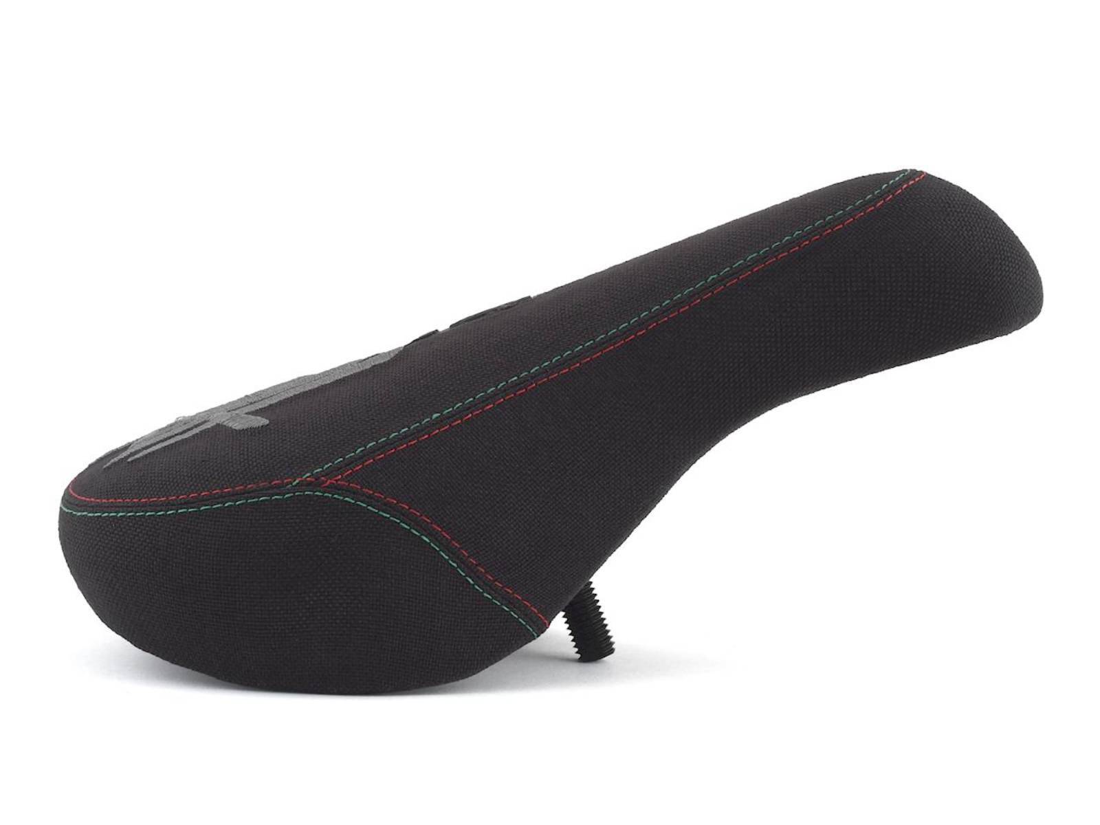 Толстое и мягкое седло с креплением Pivotal. Седло прикручивается сквозным болтом сверху к подседельному штырю и легко регулируется угол наклона. Материал обшивки - прочная кевларовая ткань. Классическая платформа. Корпус имеет множество рёбер жёсткости. Вышитые логотипы на верхней части седла с инициалами райдера, а так же на задней части выполненные вышивкой эмодзи. Стильная цветная строчка на швах. Промодель Alex Hiam.